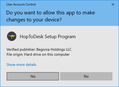 In esecuzione su Windows Dopo aver scaricato il file .exe di Windows, aprilo e sei pronto per connetterti o ricevere connessioni in entrata. Fare clic sul pulsante Installa in basso a sinistra per installare il servizio HopToDesk, che consente un maggiore controllo per il partner di connessione.